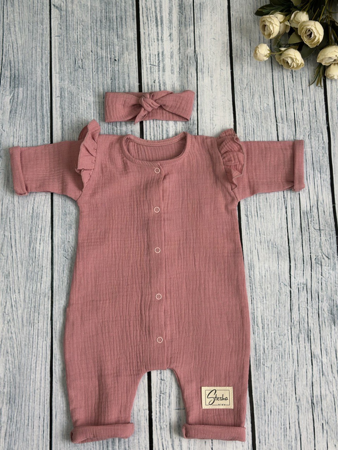Теги: Купить оптом детский комбинезон . 336-П. Комбинезон с повязкой для девочки из муслина, хлопок 100%, размеры 56,62,68, пудра цена,отзывы официальный сайт "Стеша Ставрополь"